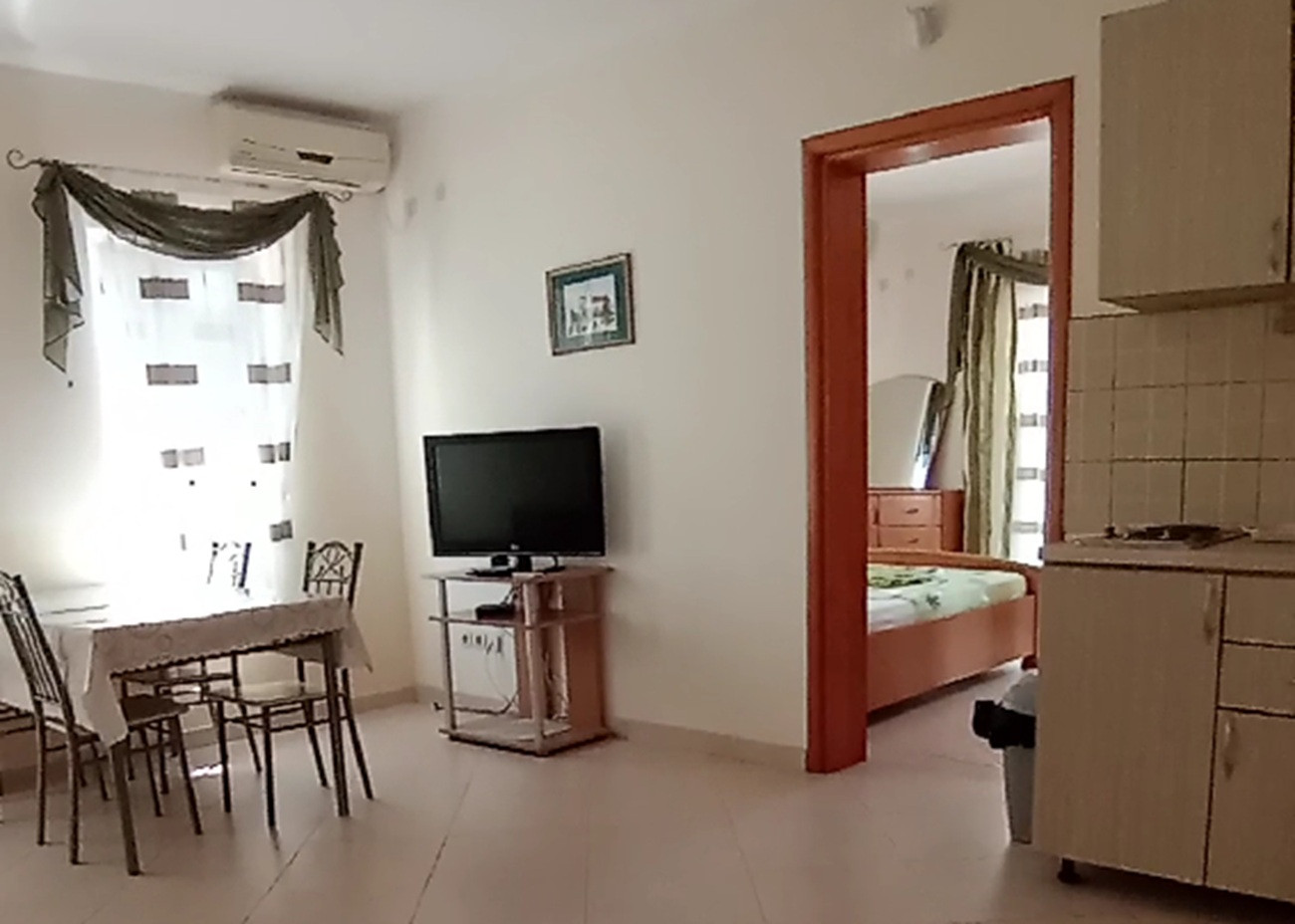 Apartment Delfin 2 befindet sich im Erdgeschoss und bietet Platz für 4 Personen. Es verfügt über einen geräumigen Wohnbereich mit einem Schlafsofa sowie einem Esstisch mit Stühlen und einer kleinen Küchenzeile sowie einem separaten Schlafzimmer mit einem Doppelbett. Das große Badezimmer verfügt über eine Dusche und WC. Das Highlight des Apartments ist der Balkon nach Süden ausgerichtet mit Blick aufs Meer.