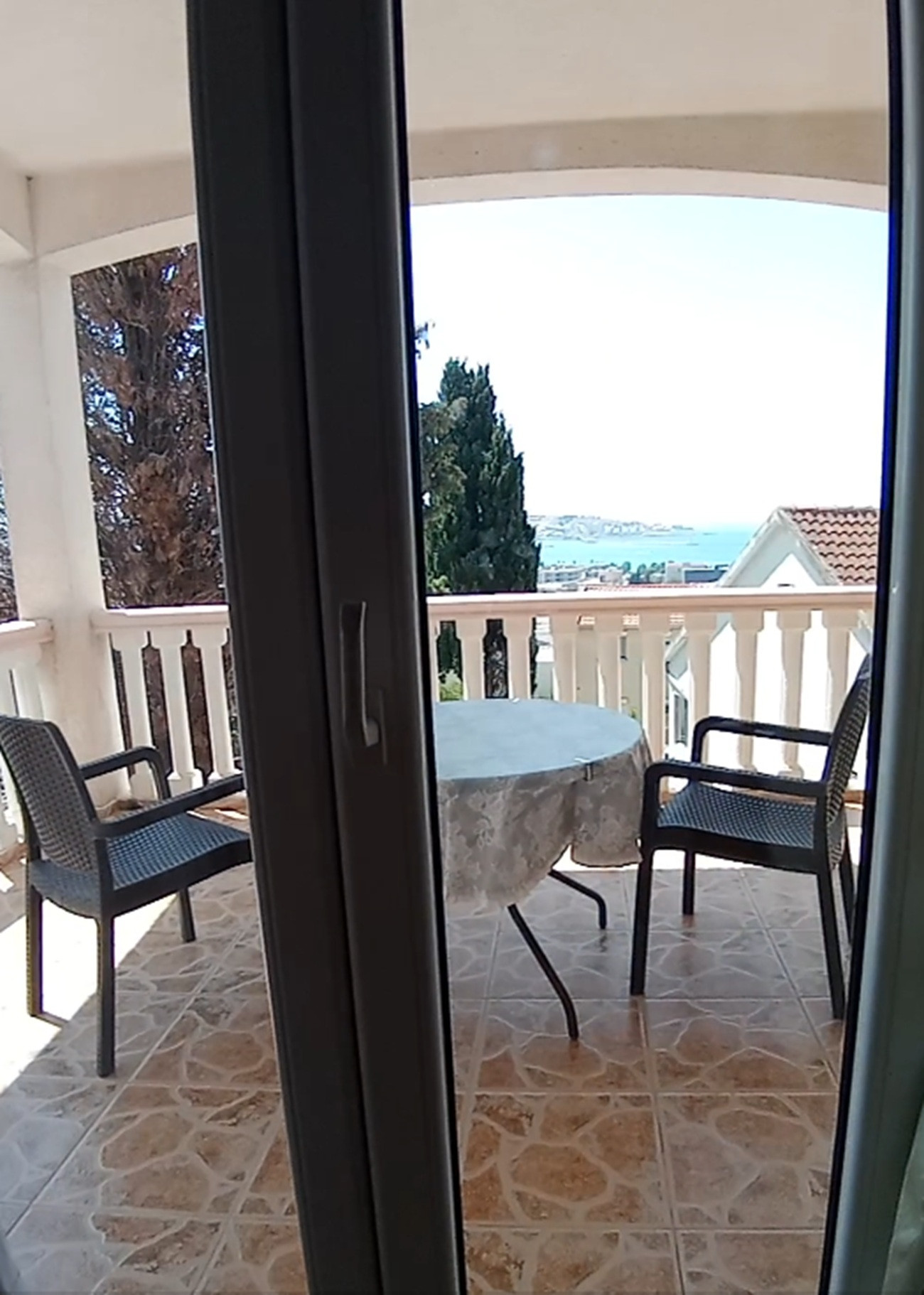 Das Apartmenthaus ist zentral gelegen – in der Nähe von Geschäften (400 m), Restaurants und dem Stadtstrand Susanski Plaza (700 m) – und dennoch eingebettet in einen ruhigen Garten mit gemeinschaftlichem Grillplatz und Pool. Die letzten 500 Meter zur Unterkunft führen bergauf über eine schmale Straße in das ruhige Wohngebiet von Susanj. Dank der leicht erhöhten Lage genießen Sie von fast allen Apartments einen herrlichen Meerblick. Auf dem Gelände der Villa Delfin stehen bis zu vier Parkplätze sowie ein zentraler Müllcontainer zur Verfügung.