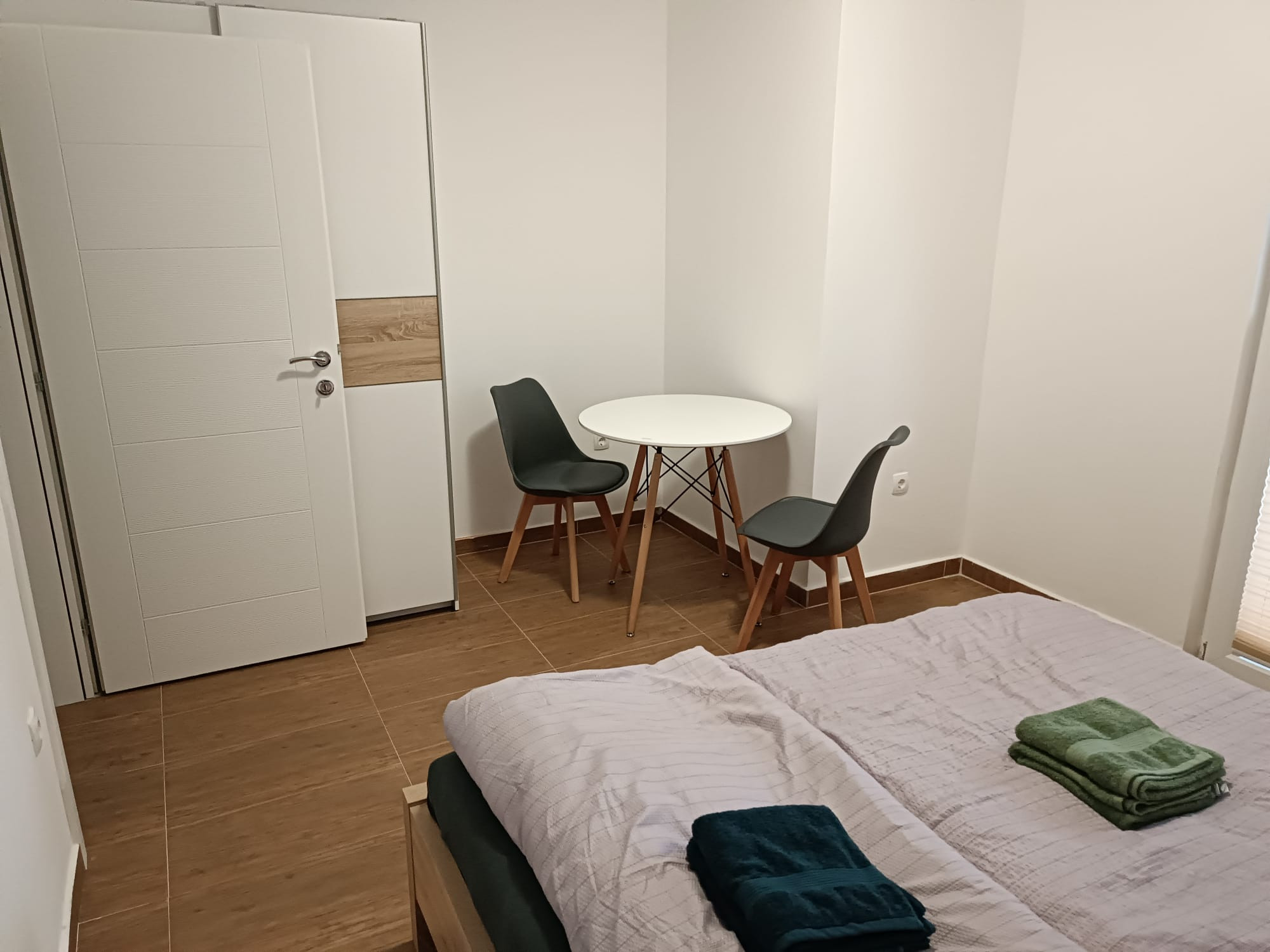 Das Apartment 1 im Erdgeschoss hat circa 30 Quadratmeter und verfügt über zwei gemütliche Schlafzimmer mit je einem Doppelbett, ein geräumiges Badezimmer mit Dusche, einer kleinen Sitzecke sowie einer Kitchenette. Die Küchenzeile ist komplett ausgestattet und bietet alles, was Sie zum Kochen benötigen: Kühlschrank, Geschirr, Küchenutensilien und einen Wasserkocher. Klimaanlage und WLAN sind ebenfalls verfügbar.