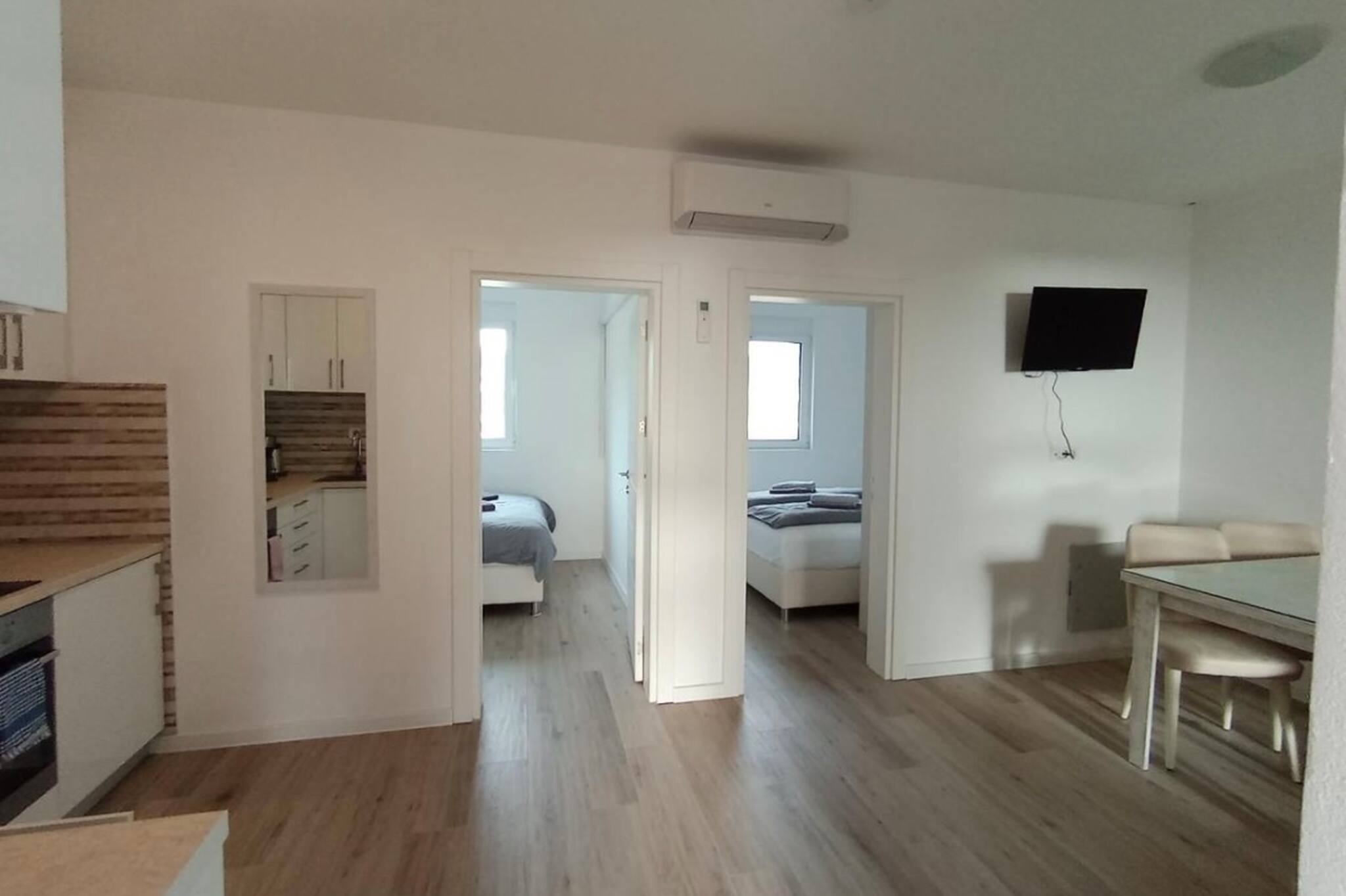The holiday apartments are distributed across 3 floors and have the same equipment. Each apartment has a large living/dining area with a fully equipped kitchen, dining area and large sofa. Each of the two bedrooms has a double bed and a wardrobe. The bathroom is equipped with a shower/WC and hairdryer. The apartment can be booked for a maximum of 6 people and offers free WiFi, air conditioning, TV and a safe.