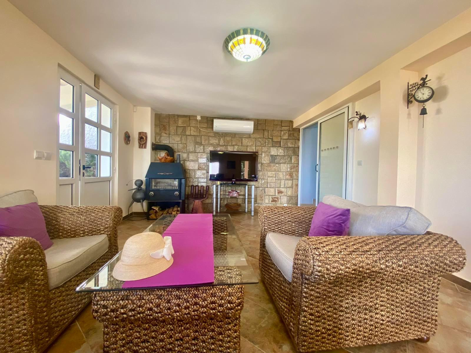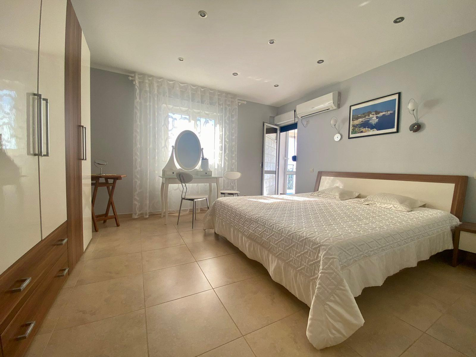 The generously designed holiday home offers plenty of space for a great holiday with family or friends. Particularly great for spending time with loved ones is the beautifully landscaped garden with a pool and the covered terraces on the ground floor and first floor. Those who wish can prepare delicious Montenegrin delicacies on the gas barbecue in the garden and enjoy the wonderful view of the sea. The nearest beach is only 500 m away and the town centre of Sutomore is about a 20-minute walk. The 160 m² holiday home with its own garden and pool has 4 bedrooms with comfortable double beds, a sofa bed, a fully equipped kitchen and a spacious living room with a cosy sofa and large dining area. Additionally, a washing machine is available for free use in the small laundry room.